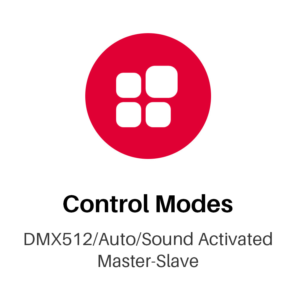 - Control Modes: DMX512, Auto, Sound Activated, Master-Slave