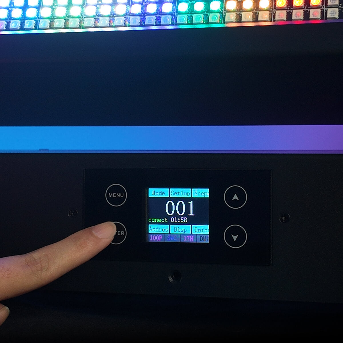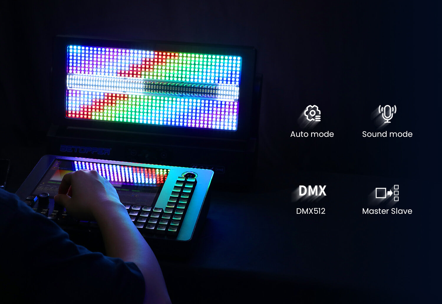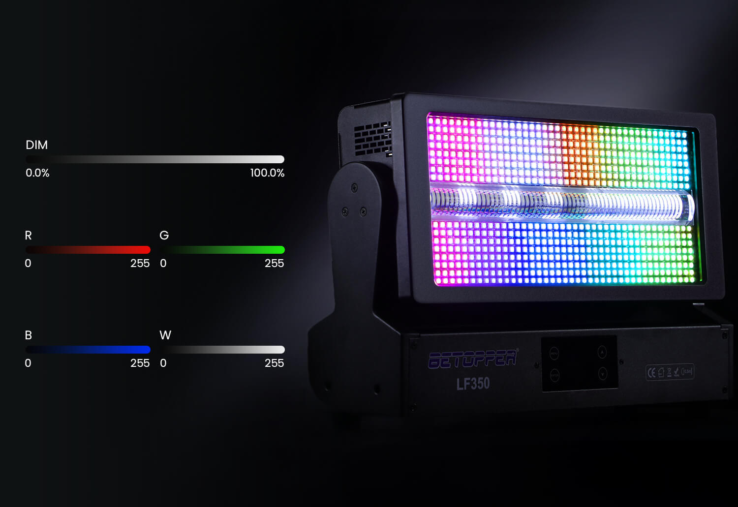 The LF350 offers multiple control modes, including DMX512, Auto Run, Sound Active, and Master–Slave, making it easy to integrate into any workflow. Users can select 17CH, 38CH, or 73CH depending on whether they need quick plug-and-play operation or full access to pixel and effect programming on a DMX console.