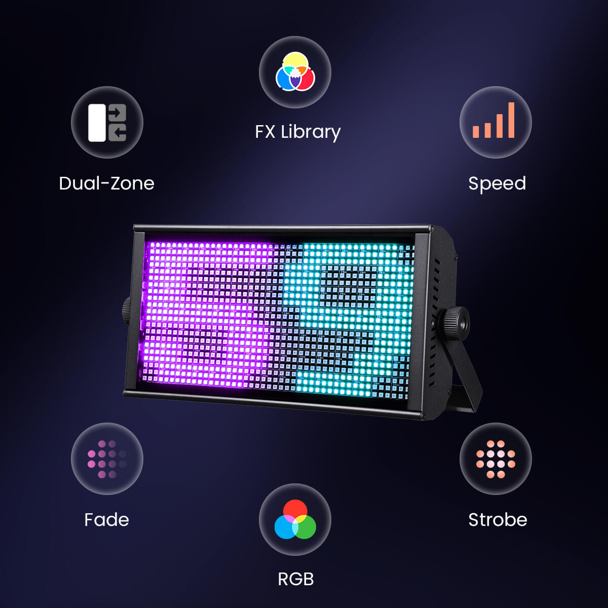 Equipped with 36 animation modes in Zone A and 41 unique modes in Zone B, the LF105 operates on a dual-zone motion engine that processes each side independently. This architecture enables asynchronous movement, layered effects, contrasting color behaviors, and complex split-zone visuals without additional programming effort—expanding creative possibilities while maintaining precise control.