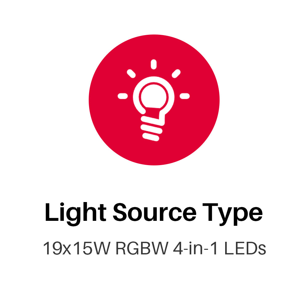 - Light source type: 19×15W (RGBW 4-in-1) LEDs + 66×0.2W (RGB 3-in-1) LED Strip
