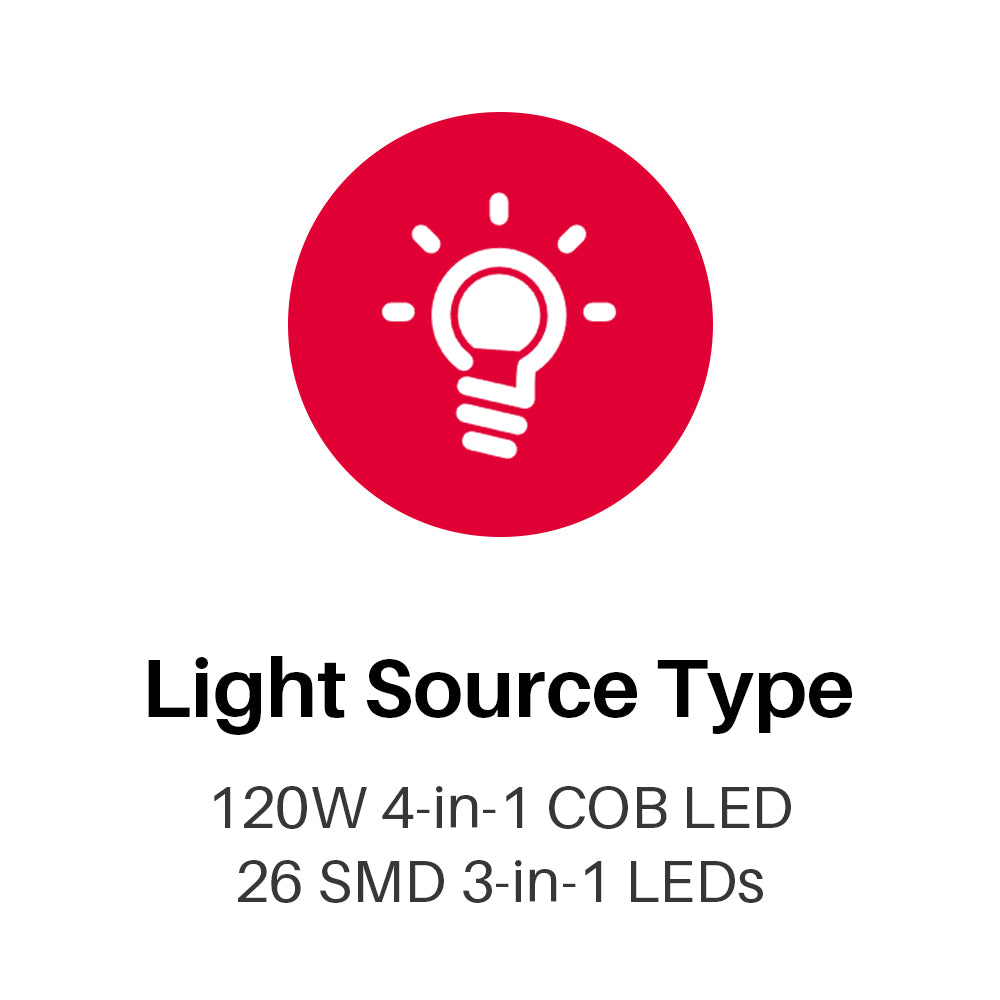 - Type: 1×120W 4-in-1 COB LED + 26 SMD 3-in-1 LEDs