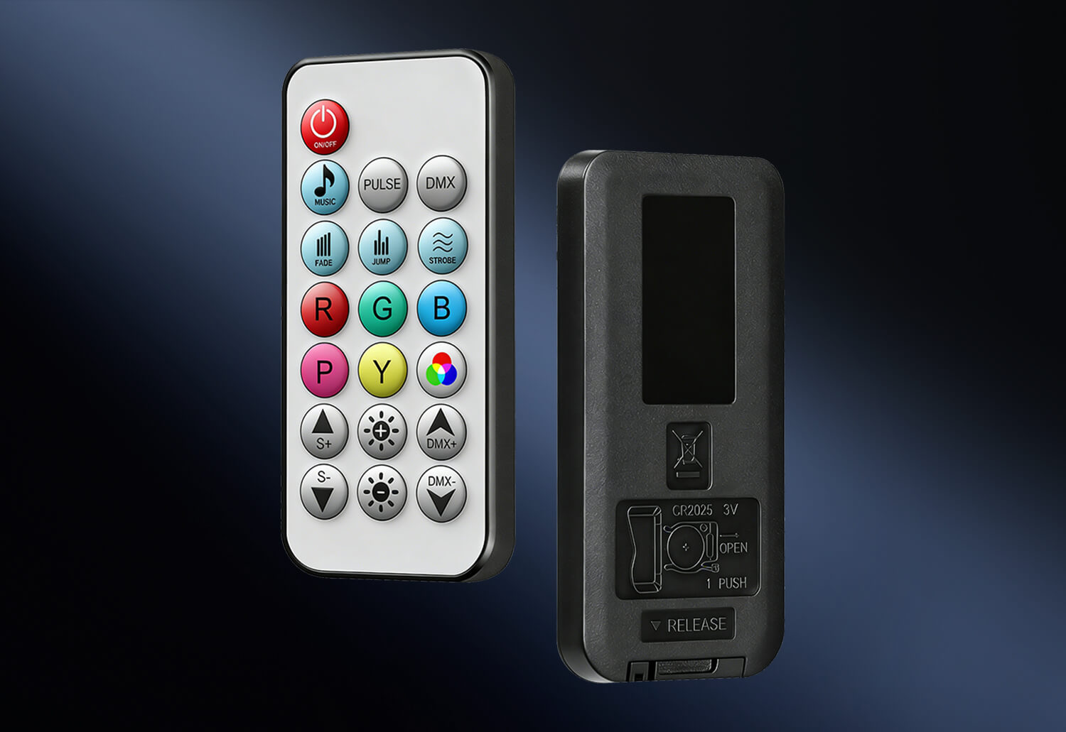 Easily control the light without extra cables or a console. The infrared remote allows instant color switching, brightness adjustment, and mode selection between auto and sound-active operation, offering wide range and fast response for DJs, beginners, and small event setups.